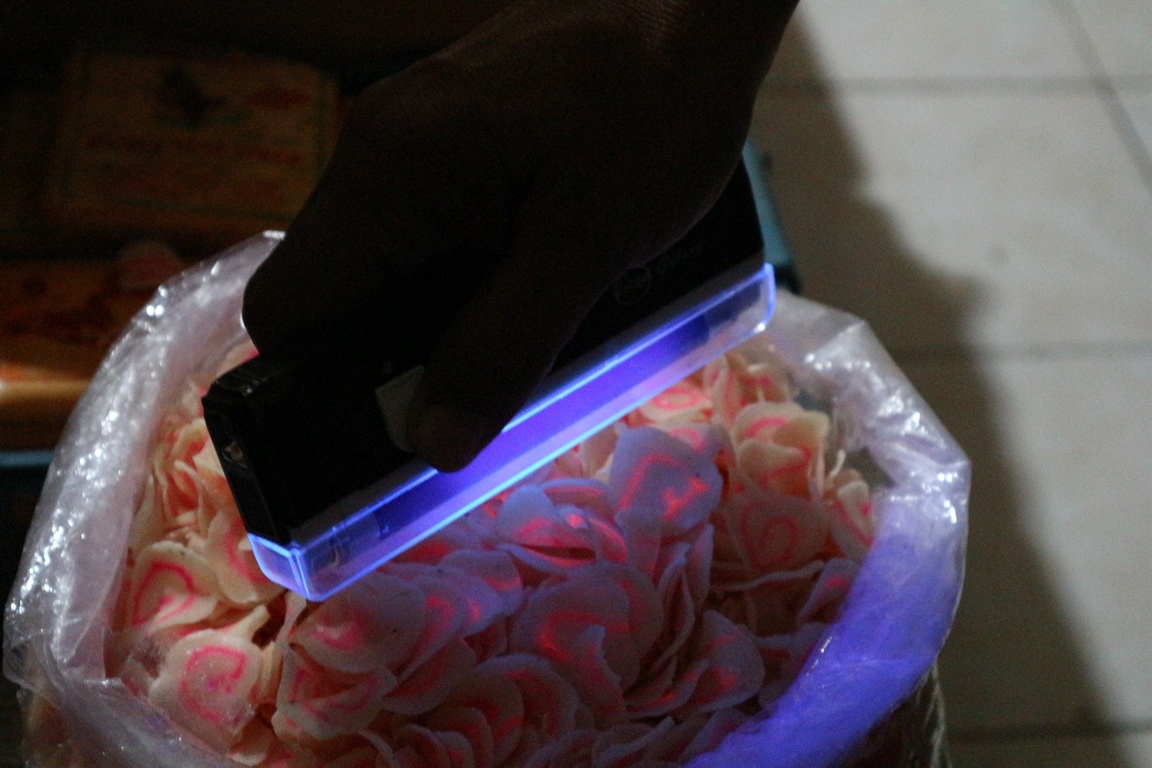 “Sebenarnya untuk mengetahui makanan itu menggunakan pewarna tekstil atau tidak bisa dilihat dengan sinar UV, pedagang sebetulnya bisa membeli alat tersebut untuk mengetahui secara sederhana makanan tersebut mengandung Rhodamin B atau tidak,” kata Uning.
